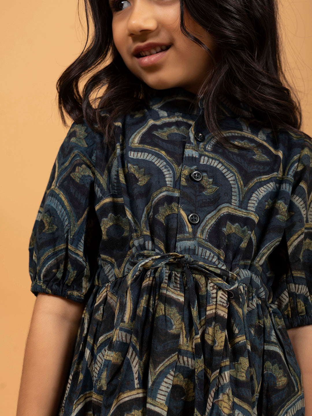 For an effortlessly stylish look, the Kids Dark Blue Printed Flared Cotton Dress features a distinct print, adding variety to their wardrobe. Its twirl-worthy flare and breathable fabric make it a delightful addition for any little fashionista.